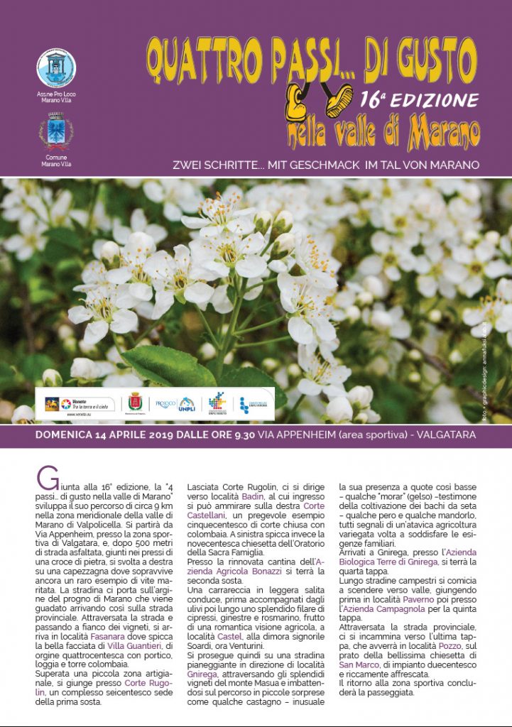 Giunta alla 16° edizione, la “4 passi… di gusto nella valle di Marano” sviluppa il suo percorso di circa 9 km nella zona meridionale della valle di Marano di Valpolicella. Si partirà da Via Appenheim, presso la zona sportiva di Valgatara, e, dopo 500 metri di strada asfaltata, giunti nei pressi di una croce di pietra, si svolta a destra su una capezzagna dove sopravvive ancora un raro esempio di vite maritata. La stradina ci porta sull’argine del progno di Marano che viene guadato arrivando così sulla strada provinciale. Attraversata la strada e passando a fianco dei vigneti, si arriva in località Fasanara dove spicca la bella facciata di Villa Guantieri, di orgine quattrocentesca con portico, loggia e torre colombaia. Superata una piccola zona artigianale, si giunge presso Corte Rugolin, un complesso seicentesco sede della prima sosta. Lasciata Corte Rugolin, ci si dirige verso località Badin, al cui ingresso si può ammirare sulla destra Corte Castellani, un pregevole esempio cinquecentesco di corte chiusa con colombaia. A sinistra spicca invece la novecentesca chiesetta dell’Oratorio della Sacra Famiglia. Presso la rinnovata cantina dell’Azienda Agricola Bonazzi si terrà la seconda sosta. Una carrareccia in leggera salita conduce, prima accompagnati dagli ulivi poi lungo uno splendido filare di cipressi, ginestre e rosmarino, frutto di una romantica visione agricola, a località Castel, alla dimora signorile Soardi, ora Venturini. Si prosegue quindi su una stradina pianeggiante in direzione di località Gnirega, attraversando gli splendidi vigneti del monte Masua e imbattendosi sul percorso in piccole sorprese come qualche castagno, inusuale la sua presenza a quote così basse − qualche “morar” (gelso) − testimone della coltivazione dei bachi da seta − qualche pero e qualche mandorlo, tutti segnali di un’atavica agricoltura variegata volta a soddisfare le esigenze familiari. Arrivati a Gnirega, presso l’Azienda Biologica Terre di Gnirega, si terrà la quarta tappa. Lungo stradine campestri si comincia a scendere verso valle, giungendo prima in località Paverno poi presso l’Azienda Campagnola per la quinta tappa. Attraversata la strada provinciale, ci si incammina verso l’ultima tappa, che avverrà in località Pozzo, sul prato della bellissima chiesetta di San Marco, di impianto duecentesco e riccamente affrescata. Il ritorno alla zona sportiva concluderà la passeggiata.