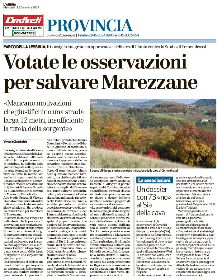 Sia. La nostra posizione contro l’escavazione a Marezzane è stata espressa