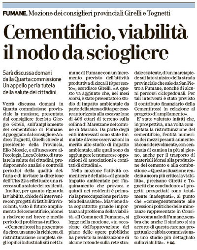 FUMANE. Mozione dei consiglieri provinciali Girelli e Tognetti