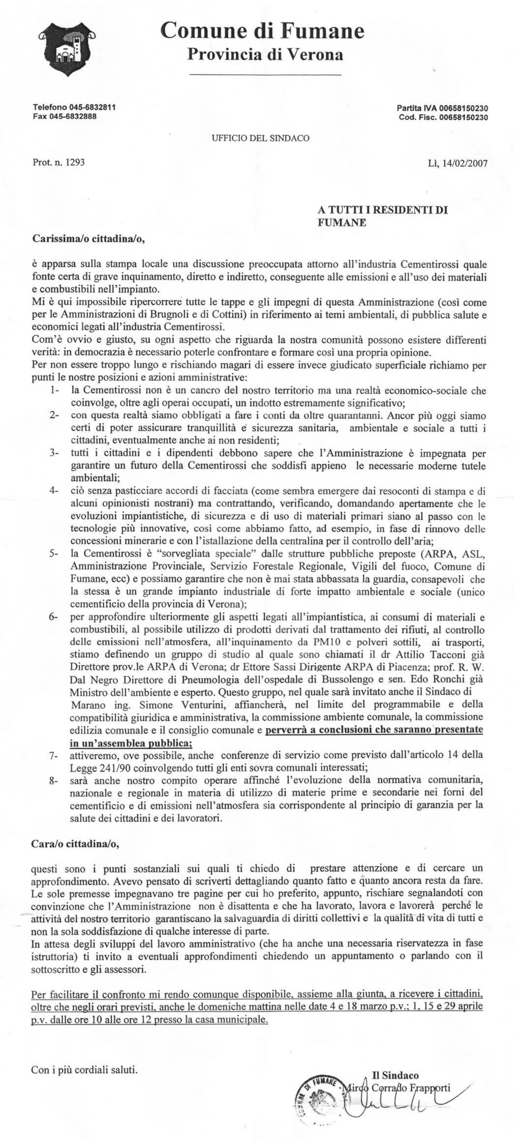 LETTERA DEL SINDACO ALLA POPOLAZIONE DI FUMANE