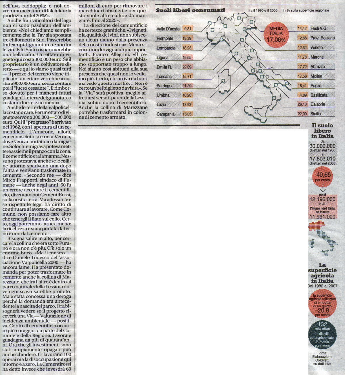 cemento cancella i vigneti Repubblica — 21 maggio 2008 pagina 42 sezione: CRONACA Ortona (chieti) - Ecco, il "Centro Oli" dell' Eni dovrebbe cominciare qui, dove partono i filari di vitigni chardonnay. La campagna sembra un giardino, con il mare davanti e la Maiella alle spalle. Fra poco arriveranno le ruspe a abbatteranno tutto. Dodici ettari di viti preziose lasceranno lo spazio al Centro Oli, che non c' entra nulla con olive ed extravergine ma è solo la traduzione volutamente ingannevole di "Oil center", centro petrolio. In pratica: un impianto di prima raffinazione del petrolio estratto da due piattaforme che sono in mare e da altri pozzi in allestimento in mezzo Abruzzo. «Noi non vogliamo - dice Raffaele Cavallo, presidente Slow Food in questa regione - che anche qui appaiano i cartelli che sono stati affissi a Viggiano, in Basilicata, in un impianto simile a quello che si vuol costruire sulle nostre colline. «Idrogeno solforato: velenoso, infiammabile ed esplosivo. Non fidarsi dell' odorato per accertare la presenza di gas. L' idrogeno solforato paralizza il senso dell' odorato». Siamo nella regione più verde d' Italia, con tre parchi nazionali. I vini doc Montepulciano e Trebbiano d' Abruzzo finalmente rendono la giusta mercede a migliaia di contadini che grazie ai vigneti non sono stati costretti all' emigrazione. Perché vogliamo rovinare tutto?». Petrolio in mezzo ai vigneti del Moltepulciano, Alta velocità che spazza via il 20% del Lugana doc al lago di Garda, un cementificio che vuole «mangiare» altre colline proprio nel cuore dell' Amarone in Valpolicella. Un tempo tutto questo sarebbe stato chiamato «progresso»: con le buste paga dell' industria i contadini poveri hanno cambiato la loro vita. «Ma l' industria del petrolio - raccontano Giancarlo Di Ruscio e Carmine Rabottini, presidenti delle cantine sociali di Tollo - arriva a mettere radici da noi in ritardo di decenni. La povertà per fortuna è un ricordo. Le nostre cooperative, con 1.360 soci, hanno un fatturato di 40 milioni di euro. Nell' ortonese, dove sorgerà l' impianto Eni, il vino incassa 150 milioni. Noi non siamo i talebani dell' ambiente. Abbiamo accolto a braccia aperte industrie come la Savel del gruppo Fiat e la Honda che sono in fondovalle e distribuiscono migliaia di salari. Ma il petrolio oggi non porta nemmeno posti di lavoro. Per il Centro Oli sono previste 27 assunzioni, con un investimento di 120 milioni di euro. Il danno per noi sarebbe terribile. Sta andando forte il turismo colto, di chi viene a comprare il vino doc ma vuole vivere qualche ora in mezzo a una natura intatta». Per ora i lavori sono bloccati, con una delibera regionale che impedisce ogni costruzione sulla costa, ma solo fino alla fine dell' anno. Il presidente della Regione Ottaviano Del Turco è favorevole al Centro Oli, contrari gli assessori ad ambiente, sanità e turismo. «Il fatto grave - dice Raffaele Cavallo di Slow Food - è che nessuno aveva parlato di una industria così pesante. Il centro veniva presentato come un deposito di petrolio e niente altro. Solo da pochi mesi abbiamo saputo che si tratta invece di un impianto con un pesantissimo impatto ambientale. Le spiagge di Francavilla sono quasi sotto la collina del Centro Oli, Pescara è a soli 13 chilometri. Non vogliano finire come a Viggiano, che 15 anni fa ha accolto il centro Eni come una benedizione perché tanti disoccupati speravano in un lavoro. Il lavoro è sempre scarso e un quarto della popolazione è fuggita perché non vuole convivere con l' idrogeno solforato che puzza di uovo marcio». È passato più di un secolo da quando "sembrava il treno stesso un mito di progresso". Oggi, a Peschiera del Garda, i produttori del Lugana doc sono invece arrabbiati perché la linea della Tav vuole cancellare il 20% dei loro vigneti. «Il progetto per questa linea ferroviaria - dice Francesco Montresor, presidente del consorzio che tutela questo vino - è del 1991 e 17 anni oggi sono un secolo. Chi immaginava, allora, il petrolio a 118 dollari al barile? Quando un ingegnere, nel suo studio milanese, ha tracciato una riga sulla carta geografica ed ha stabilito che la Tav doveva passare da Desenzano, Peschiera e Sirmione, si pensava che costruire, produrre e consumare fosse comunque positivo. Adesso si ragiona in modo diverso: si è capito che il progresso è consumare meno, tutelare, conservare. Vuol dire valorizzare la nostra storia e le nostre radici. Già Gaio Valerio Catullo esaltava la "Lucana silva", boscaglia con vitigni a bacca bianca. Ora il Lugana è richiesto anche in Giappone, da tre anni a questa parte ogni anno il prezzo dell' uva raddoppia: e noi dovremmo accettare di falcidiare la produzione del 20%?». Anche fra i viticoltori del lago non ci sono pasdaran dell' ambiente. «Noi chiediamo semplicemente che la Tav sia spostata tre chilometri a Sud. Passerebbe fra i campi di granoturco e non fra le viti. E lo Stato risparmierebbe una bella cifra. Un ettaro di vigneto qui costa 300.000 euro. Se il proprietario è un coltivatore diretto - e qui lo siamo quasi tutti - il prezzo del terreno viene triplicato: un ettaro verrebbe a costare 900.000 euro, senza contare poi il "lucro cessante", il rimborso dovuto per i mancati futuri guadagni. Le terre del granoturco costano due terzi in meno». Anche le terre della Valpolicella costano care. Per un ettaro di vigneto servono 300.000 - 500.000 euro. Qui il "progresso" è arrivato nel 1962, con l' apertura di un cementificio. L' Amarone, allora, era conosciuto sì e no a Verona, dove veniva portato in damigiane. Solo chi emigrava poteva mettere assieme il pranzo con la cena. Il cementificio era la manna. Nessuno protestava, anche se le colline attorno sparivano una dopo l' altra e venivano trasformate in cemento. «Secondo me - dice Mirco Frapporti, sindaco di Fumane - anche negli anni '60 fu un errore accettare il cementificio, diventato poi CementiRossi, sulla nostra terra. Ma adesso c' è e se rispetta 