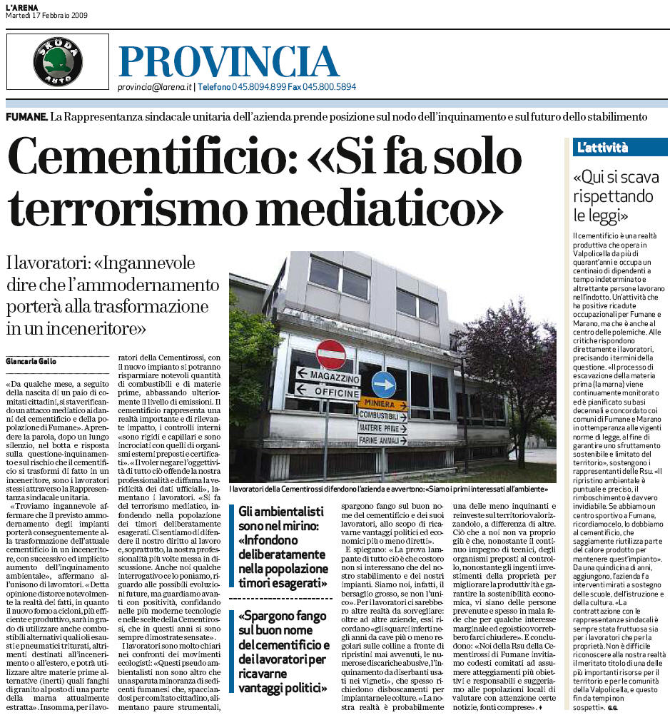 cementificio e della popolazione di FUMANE». A prendere la parola, dopo un