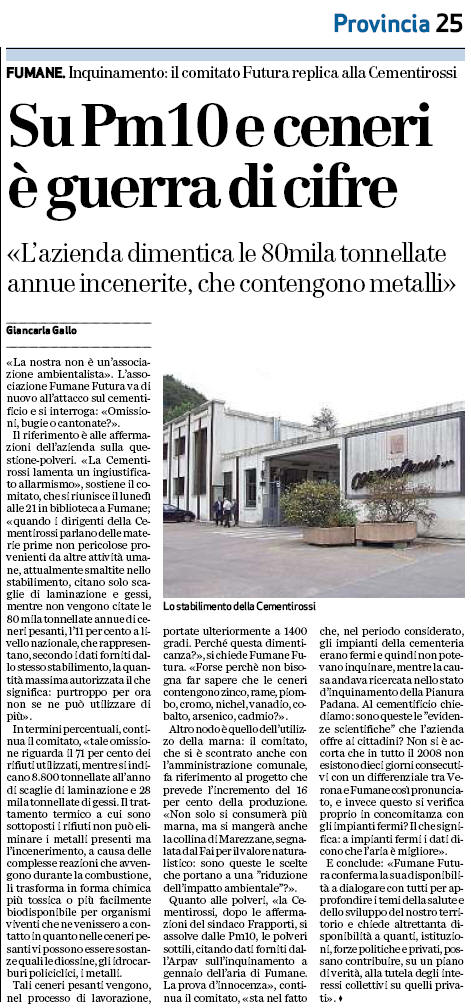 FUMANE. Inquinamento: il comitato Futura replica alla Cementirossi