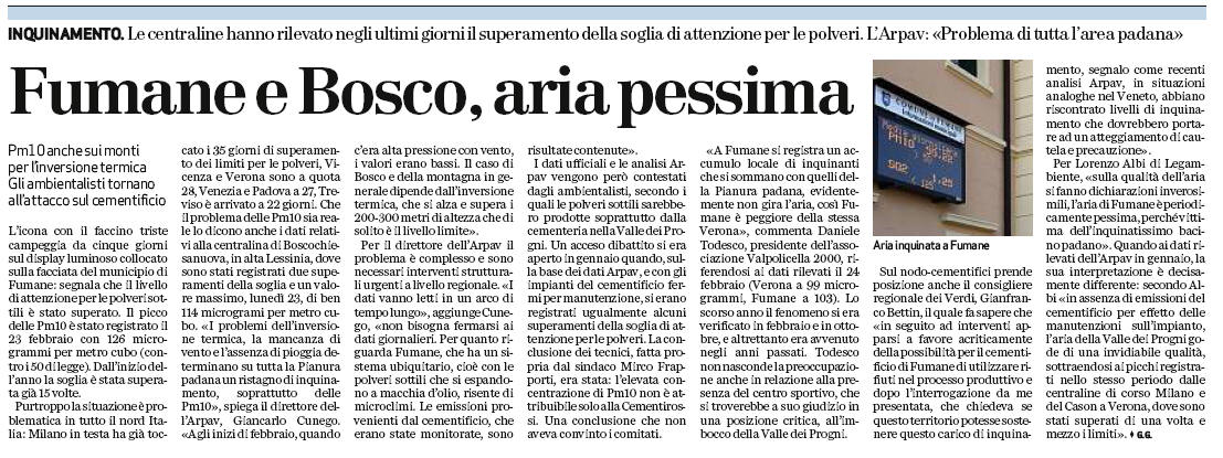 febbraio (Verona a 99 microgrammi, FUMANE a 103). Lo scorso anno il